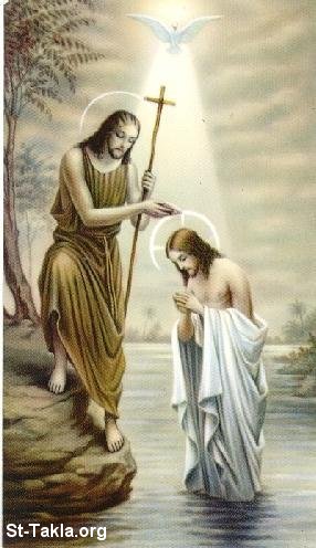 معمودية السيد المسيح بيد الشهيد يوحنا المعمدان. وبرجاء ملاحظة أن هذه الصورة هي مجرد صورة فنية عامة، ولكن بها خطأ عقيدي من جهة إظهار شكل المعمودية بالرش أو بالسكب حسب ما ينادي به الكاثوليك، ولكننا ككنيسة قبطية أرثوذكسية نرفض هذا، وتكون المعمودية الأرثوذكسية بالتغطيس.