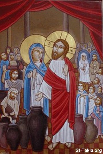 أيقونة قبطية تصور المعجزة الأولى التي صنعها السيد المسيح في فرح قانا الجليل.