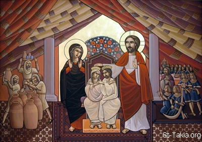 السيد المسيح يبارك العروسين الجدد (الزوج والزوجة) يوم فرح قانا الجليل، في حضور السيدة مريم العذراء