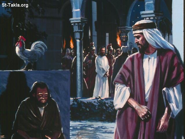 إنكار بطرس للمسيح، بطرس يبكي بكاء مرا بعد إنكار يسوع، ويظهر السيد المسيح في الخلفية سائرًا مُحاطًا بحراس.