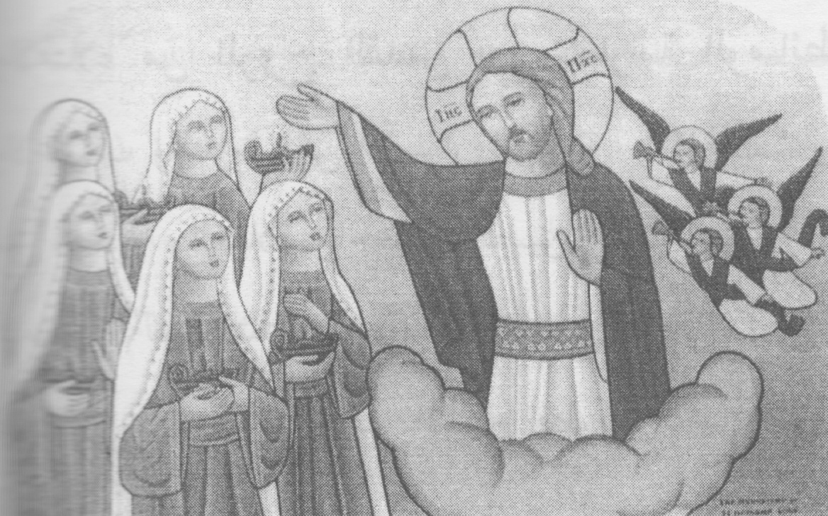 السيد المسيح مع الخمس عذارى الحكيمات، مثل العشر العذارى - أيقونة قبطية حديثة من رسم راهبات دير الشهيدة دميانة بالبراري، مصر