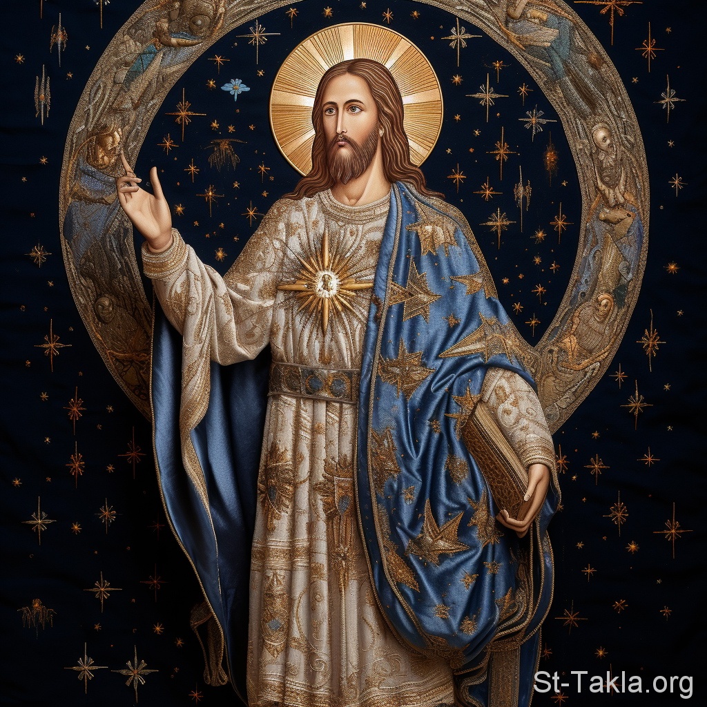 السيد يسوع المسيح، غرزة حرير: ستان ملون (صورة 5)، تطريز بخيوط مختلفة السماكة، بأشعة ذهبية اللون - فن بالذكاء الاصطناعي، فكرة مايكل غالي لموقع الأنبا تكلاهيمانوت، 29 أغسطس 2023 م.