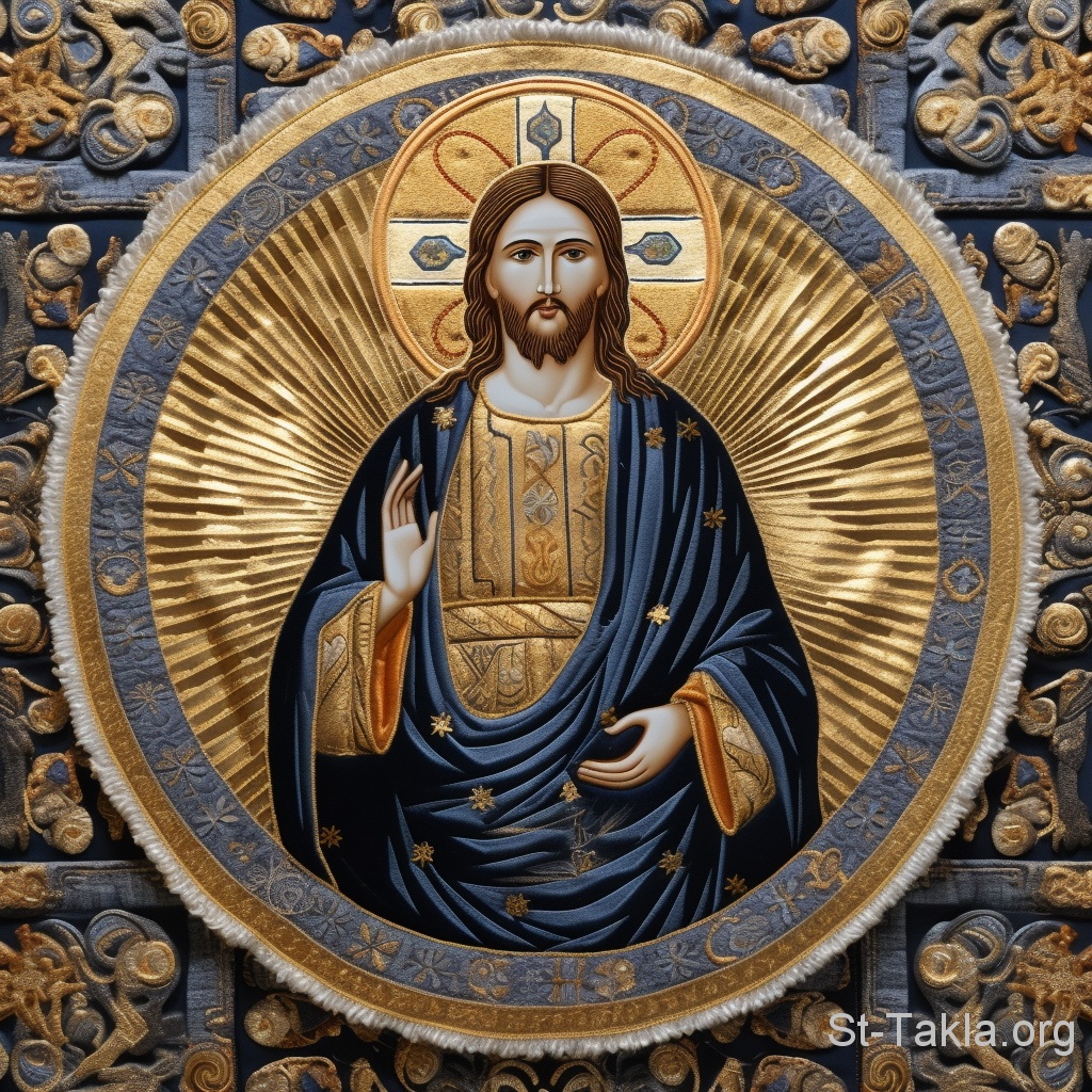 السيد يسوع المسيح، غرزة حرير: ستان ملون (صورة 8)، تطريز بخيوط مختلفة السماكة، بأشعة ذهبية اللون - فن بالذكاء الاصطناعي، فكرة مايكل غالي لموقع الأنبا تكلاهيمانوت، 29 أغسطس 2023 م.