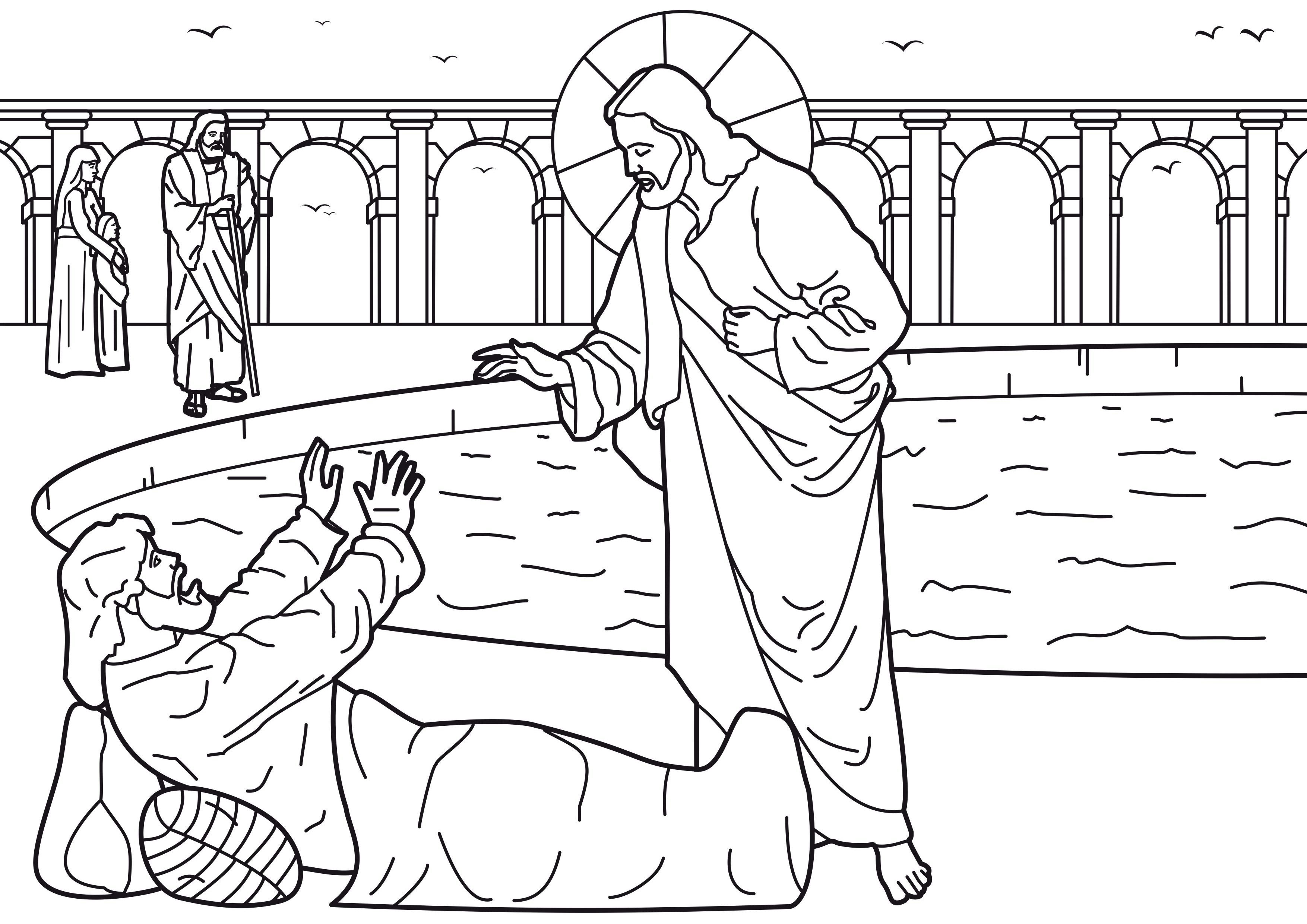 صورة تلوين شفاء مريض بركة بيت حسدا (المخلع) بواسطة السيد المسيح - موضوعة بإذن: موسوعة صور الكتاب المقدس للتلوين..