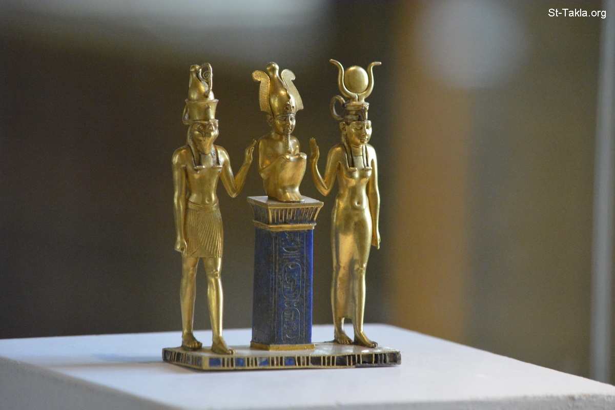 قلادة باسم الملك اوسركون الثاني (أحد فراعنة الأسرة المصرية الثانية والعشرين)، به الإله أوزوريس في الوسط، يحيط به ابنه حورس وزوجته إيزيس، ترجع لسنة 875-850 قبل الميلاد، ذهب مع زجاج أحمر ولازولي (أزرق)، بطول 9×6,60 سم. - صور متحف اللوفر (اللوڤر)، باريس، فرنسا - تصوير مايكل غالي لموقع الأنبا تكلاهيمانوت، 11-12 أكتوبر 2014 م.