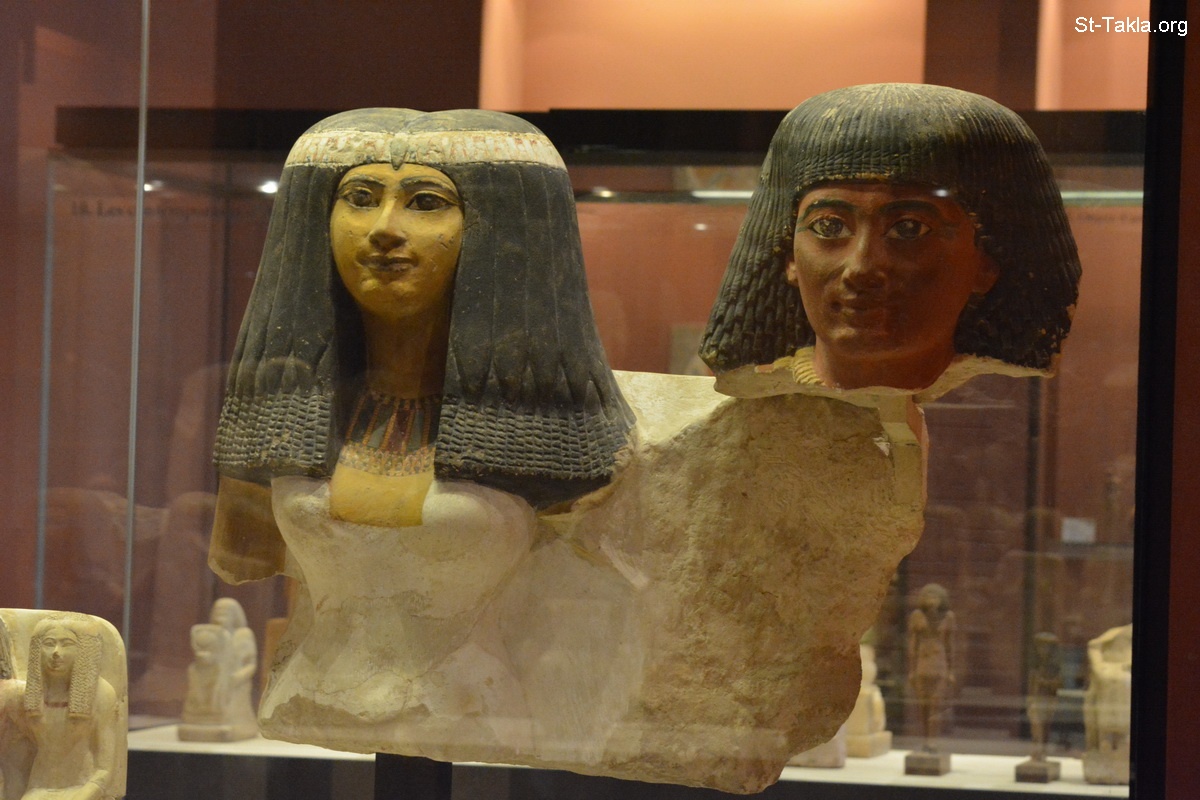 Starue of Senynefer and Meryt-E 27161, dates between 1427-1401 BC, sandstone and paint, length: 85 cm (33.4 in); height: 68 cm (26.7 in); width: 85 cm (33.4 in); thickness: 29.4 cm (11.5 in), Department of Egyptian Antiquities of the Louvre, Room 637, display case 8. - The Louvre Museum (Musée du Louvre), Paris, France - Photograph by Michael Ghaly for St-Takla.org, October 11-12, 2014.