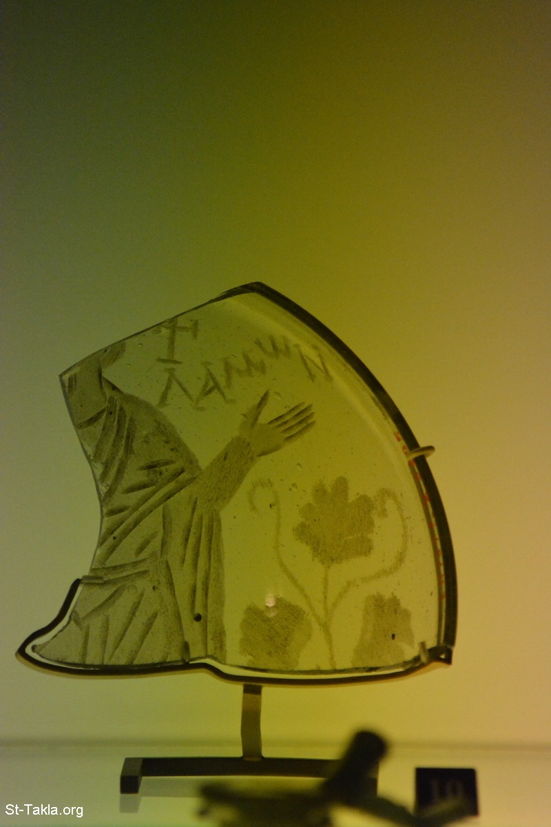 جزء من كوب منقوش يصور رجل قديس يصلي، ربما يكون هو القديس أنبا بلامون الناسك، معلم الأنبا باخوميوس - نقش على الزجاج يعود للفترة ما بين 300-400 م.، بطول 3,4 سم. - صور متحف اللوفر (اللوڤر)، باريس، فرنسا - تصوير مايكل غالي لموقع الأنبا تكلاهيمانوت، 11-12 أكتوبر 2014 م.