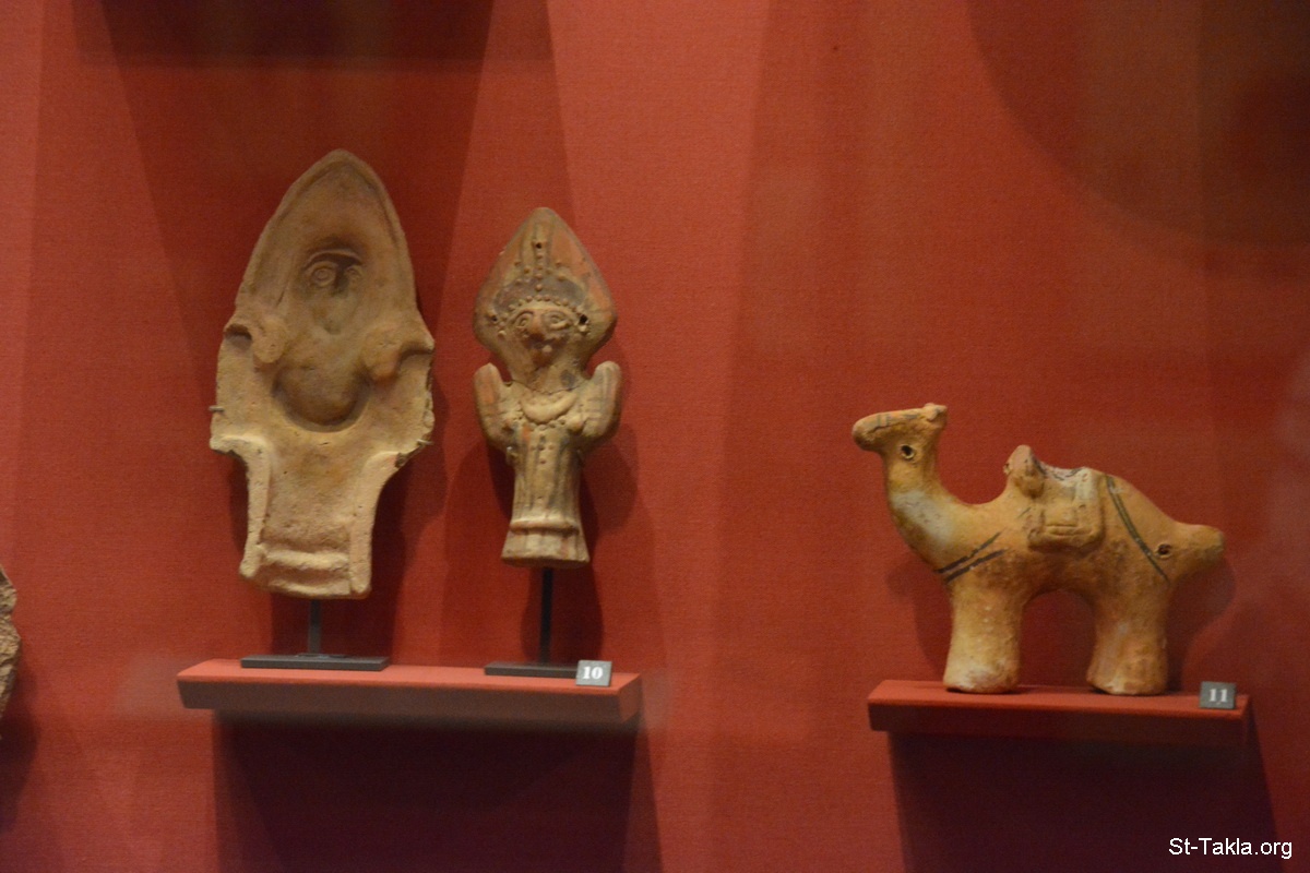 Right to left: 1- S saddled camel plastic Coptic vase, Discovery place: Coptos = Qouft (from Assiout to Thebes-> east bank of Assiout to Thebes), Height: 11.2 cm; Width: 15 cm; Depth: 3.5cm /