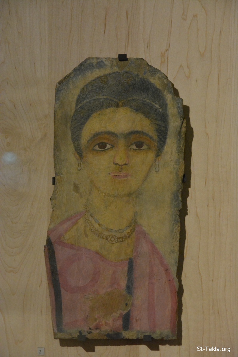 Portrait of a Mummy, from the Fayoum portraits: Fayum (Philadelphie), 350, Height: 36 cm; Width: 17 cm; Thickness: 0.5 cm, sycamore fig, tempera painting. - The Louvre Museum (Musée du Louvre), Paris, France - Photograph by Michael Ghaly for St-Takla.org, October 11-12, 2014.