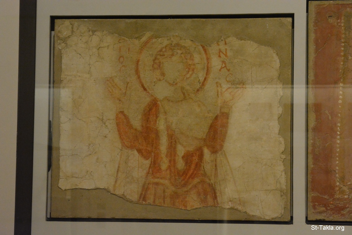 لوحة تصور القديس مارمينا العجايبي، من القرن السابع/الثامن الميلادي، مُكتشفة في منطقة القلالي، من حفائر 1964/1965 م.، رسم تمرا - صور متحف اللوفر (اللوڤر)، باريس، فرنسا - تصوير مايكل غالي لموقع الأنبا تكلاهيمانوت، 11-12 أكتوبر 2014 م.