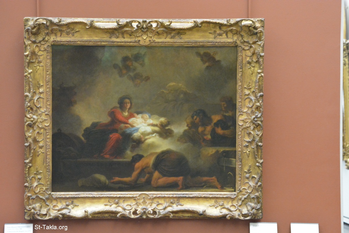 عبادة الرعاة، لوحة بريشة جان أونوريه فراجونارد، حوالي عام 1775 م.، زيت على قماش، الارتفاع: 73 سم (28.7 بوصة)؛ العرض: 93 سم (36.6 بوصة). - صور متحف اللوفر (اللوڤر)، باريس، فرنسا - تصوير مايكل غالي لموقع الأنبا تكلاهيمانوت، 11-12 أكتوبر 2014 م.