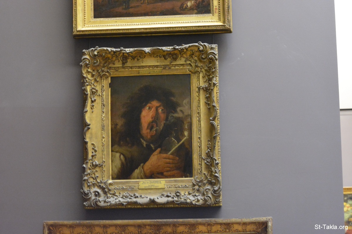 The Smoker (portrait of the artist?), painting by Joos van Craesbeeck, circa 1635 -6, H. 0.41 m. ; L. 0.32 m., oil on panel, Ecoles du Nord, room 23: Flandres, XVIIe siècle. Richelieu, 2nd floor - The Louvre Museum (Musée du Louvre), Paris, France - Photograph by Michael Ghaly for St-Takla.org, October 11-12, 2014.