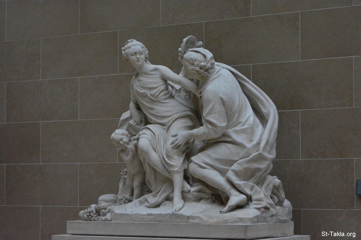 Vertumnus and Pomona (image 1), stone / pierre sculpture by Jean-Baptiste Lemoyne, created as a tribute to Louis XV and Madame de Pompadour, who had played the role in Versailles. H. 1.63 m (5 ft. 4 in.), W. 1.50 m (4 ft. 11 in.), D. 60 cm (23 ½ in.). Department of Sculptures, Richelieu, lower ground floor, Cour Puget. - The Louvre Museum (Musée du Louvre), Paris, France - Photograph by Michael Ghaly for St-Takla.org, October 11-12, 2014.