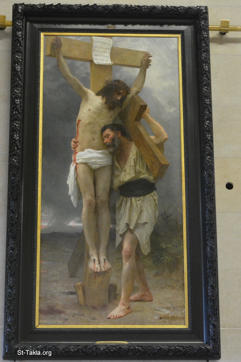 لوحة بعنوان عطف! (صورة 1) رسم الفنان وليام أدولف بوجيرو، 1897 م.، 280×130 سم.، زيت على قماش (يسوع المسيح على الصليب ، مع رجل يمثل الإنسانية: التحول إلى المسيحية من خلال التعاطف مع التضحية التي قدمها يسوع). - صور متحف أورسيه، باريس، فرنسا. الذي أنشئ عام 1986 - تصوير مايكل غالي لموقع الأنبا تكلاهيمانوت، 14 أكتوبر 2014 م.