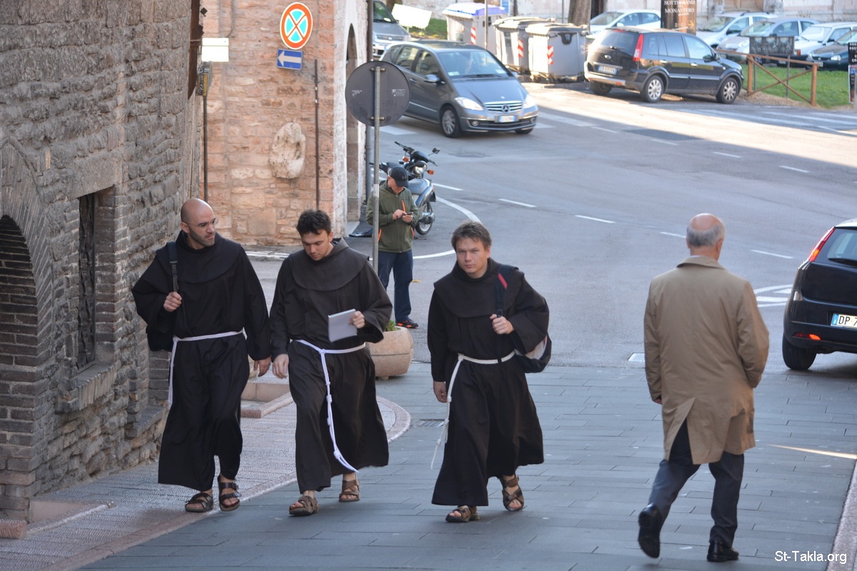 ثلاثة رهبان فرنسيسكان كاثوليك سائرين (صورة 1) - صور متنوعة من أسيزي، إيطاليا - تصوير مايكل غالي لموقع الأنبا تكلاهيمانوت، 26 سبتمبر 2014 م.