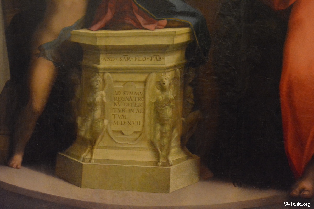Madonna of the Harpies (Madonna delle Arpie) (details 1), Virgin Mary and Child Jesus flanked by putti angels and two saints (Saint Bonaventure or Francis and John the Evangelist), altarpiece in oils, 1517, by Andrea del Sarto (1486–1530), height: 207 cm (81.4 in); width: 178 cm (70 in) - Uffizi Gallery (Galleria degli Uffizi), Florence (Firenze), Italy. It was established in 1581. - Photograph by Michael Ghaly for St-Takla.org, October 1, 2014.