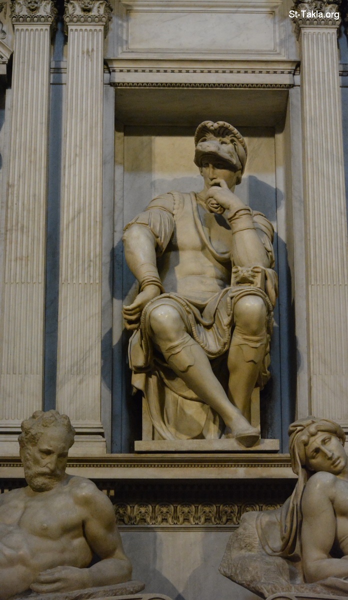 Tomb of Lorenzo di Piero de' Medici with Dusk and Dawn (details 5), by Michelangelo, 16th century - The New Sacristy (Sagrestia Nuova) at the Medici Chapel Museum (Museo delle Cappelle Medicee), Florence (Firenze), Italy. It dates back to the 16th and 17th centuries. - Photograph by Michael Ghaly for St-Takla.org, October 2, 2014.