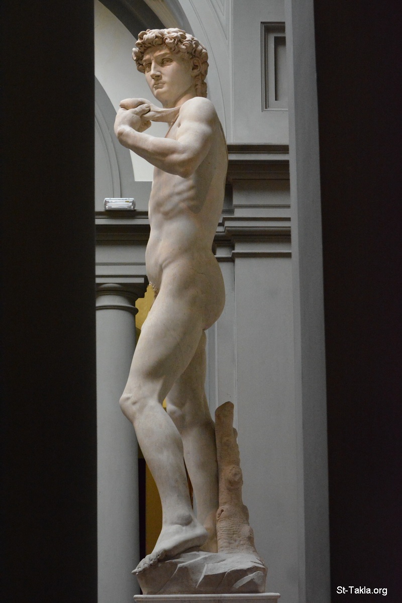David marble statue, by Michelangelo (1501-1504), 5.17 meter (details 20). The masterpiece of Renaissance sculpture depicts young David after he has made the decision to fight Goliath. - David's Room: Galleria dell'Accademia: Gallery of the Academy of Florence, Florence (Firenze), Italy. Established in 1784. - Photograph by Michael Ghaly for St-Takla.org, September 30, 2014.