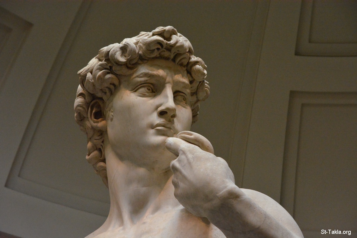 داود، تمثال رخامي يصور داود النبي بعد قراره محاربة جليات الجبار، عمل الفنان مايكل أنجلو (1501-1504)، بطول 5,17 مترًا (تفاصيل 28) - صور حجرة تمثال داود في متحف الأكاديميا، فلورنسا (فيرينزي)، إيطاليا. أُنشئ عام 1784 م. - تصوير مايكل غالي لموقع الأنبا تكلاهيمانوت، 30 سبتمبر 2014 م.