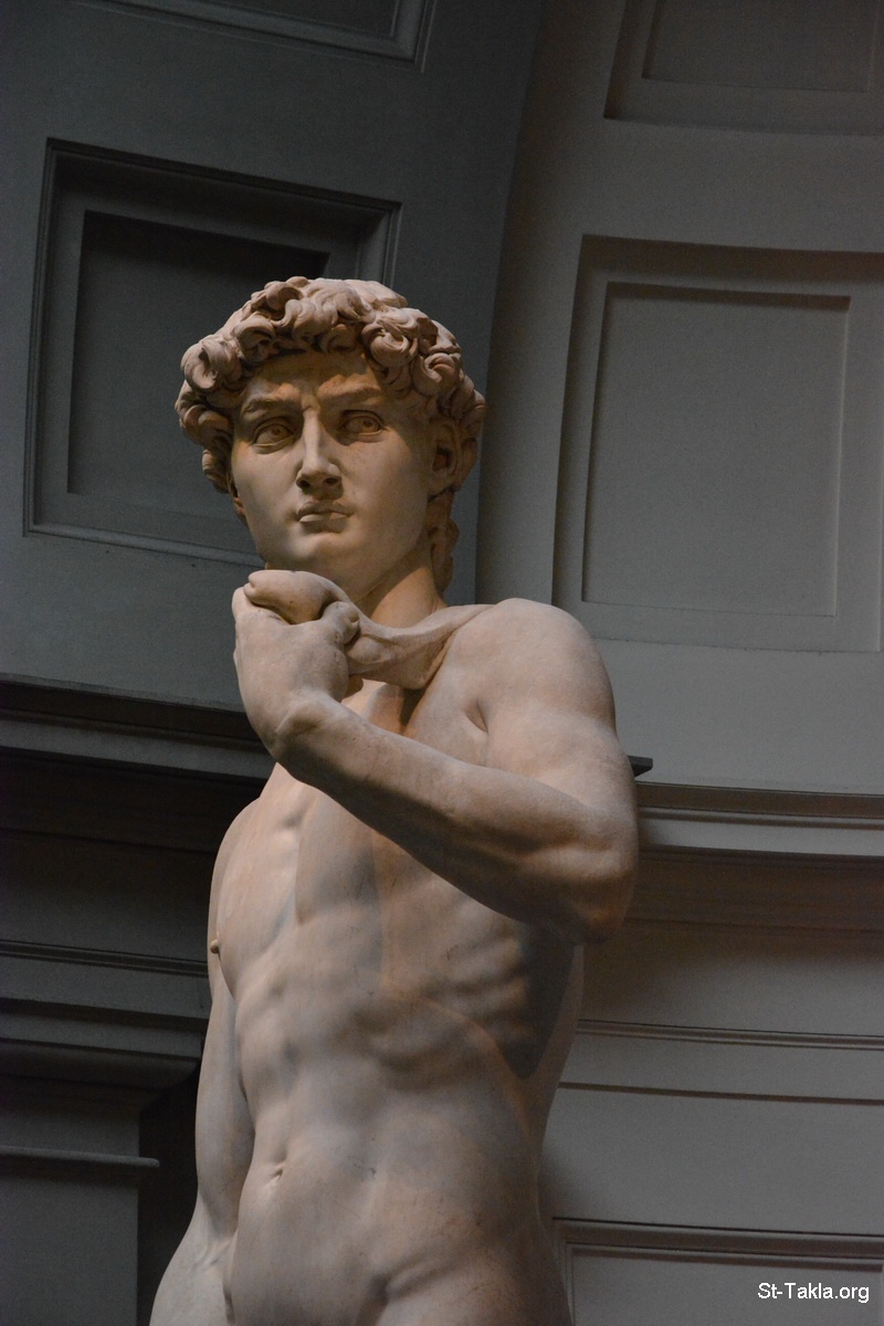 داود، تمثال رخامي يصور داود النبي بعد قراره محاربة جليات الجبار، عمل الفنان مايكل أنجلو (1501-1504)، بطول 5,17 مترًا (تفاصيل 48) - صور حجرة تمثال داود في متحف الأكاديميا، فلورنسا (فيرينزي)، إيطاليا. أُنشئ عام 1784 م. - تصوير مايكل غالي لموقع الأنبا تكلاهيمانوت، 30 سبتمبر 2014 م.