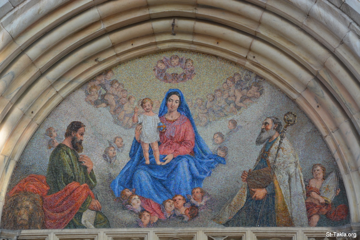 لوحة فسيفساء عمل الفنان أنجيلو إنجاني عام 1840، وفيها القديسة مريم العذراء مع الطفل يسوع، ما بين القديس مرقس الإنجيلي والقديس بطرس الرسول. وهي موجودة أعلى باب الكتيسة. - صور كنيسة القديس مرقس (مارمرقس)، ميلانو (ميلان)، إيطاليا. وقد بدأت عام 1245 ولكن انتهى البناء في القرن التاسع عشر. - تصوير مايكل غالي لموقع الأنبا تكلاهيمانوت، 4 أكتوبر 2014 م.