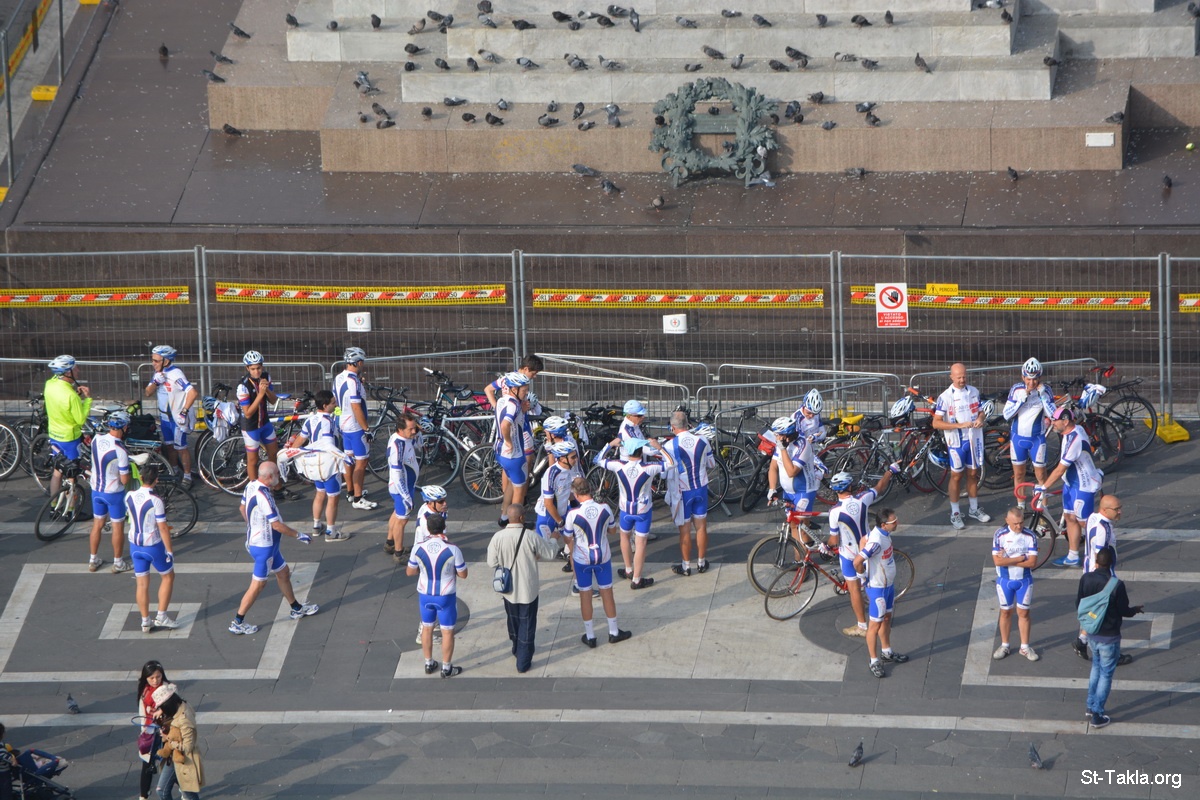 Cyclists, team respite - Terrace of the Milan Cathedral (Duomo di Milano, Lombardy), Milan (Milano) Italy. - Photograph by Michael Ghaly for St-Takla.org, October 5, 2014.