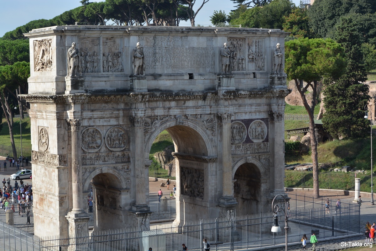 قوس قسطنطين: قوس النصر بعد نصره على ماكسنتيوس في مَعركة جِسر ميلفيان في عام 312 (صورة 1) - من صور الكولوسيوم (الكوليسيوم، الكلوسيم، المدرج الفلافي) ـ 70-80 قبل الميلاد، روما، إيطاليا - تصوير مايكل غالي لموقع الأنبا تكلاهيمانوت، 17 سبتمبر 2014 م.
