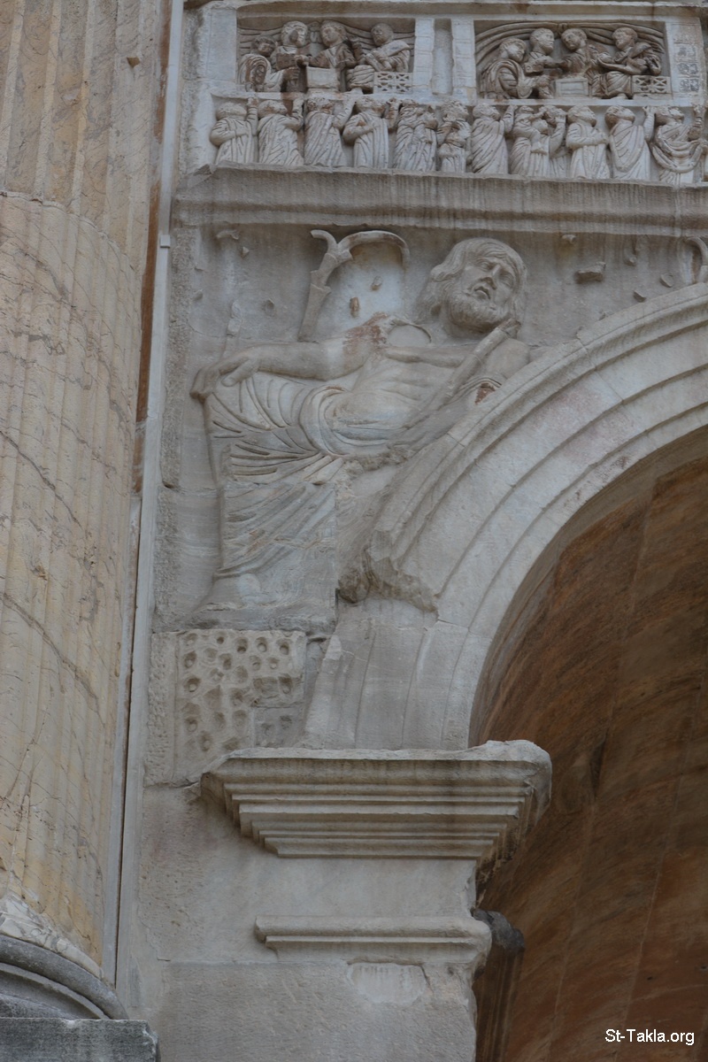 The Arch of Constantine I (Arco di Costantino), triumphal arch after the victory over Maxentius at the Battle of Milvian Bridge in 312 (photo 22) - Colosseum (Coliseum, Flavian Amphitheatre), 70–80 AD, Rome, Italy - Photograph by Michael Ghaly for St-Takla.org, September 17, 2014.