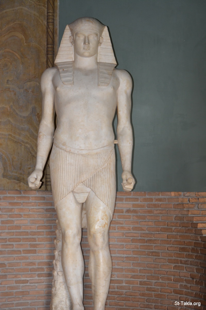 The god Antinous as Osiris. Marble, Roman artwork, second part of Hadrian's reign, ca. 131–138 CE. From the Serapaeum of the Canope in the Villa Adriana, near Tivoli, 1736 (1742: given to Benedictus XIV by Liborio Michilli; 1838: transferred to Museo Gregoriano Egiziano from Musei Capitolini) (Height: 2.4 cm (0.9 ″); Parian marble) (photo 2) - Vatican Museums, Rome, Italy - Photograph by Michael Ghaly for St-Takla.org, September 18, 2014