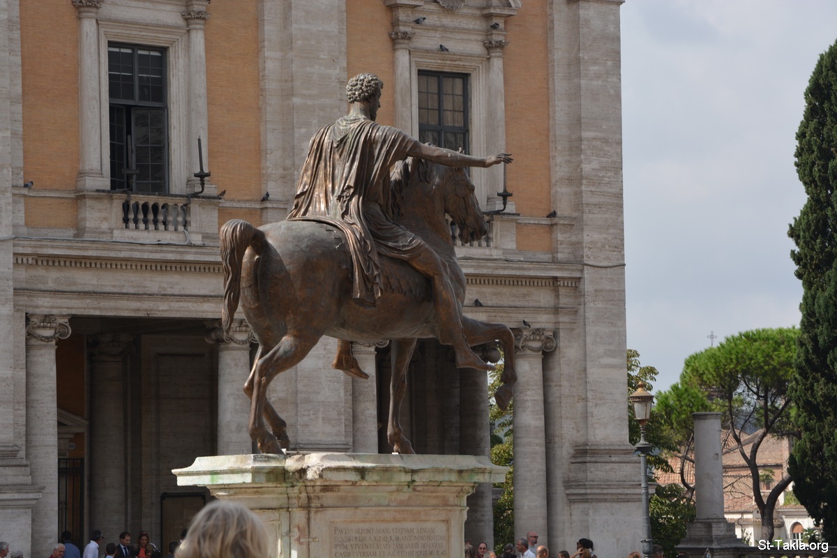 نسخة صُنِعَت سنة 1981 من تمثال برونزي يصور ماركوس أوريليوس (مرقس أوريليوس أنطونينوس أوغسطس) وهو يخاطب جيشه من فوق حصانه، طول 4,24 م. (صورة 1) - صور متاحف كابيتوليني، روما، إيطاليا. وهو مجموعة متاحف في متحف واحد، موجود في أعلى تل كاپيتوليني، وأنشئ عام 1734 م. - تصوير مايكل غالي لموقع الأنبا تكلاهيمانوت، 21 سبتمبر 2014 م.
