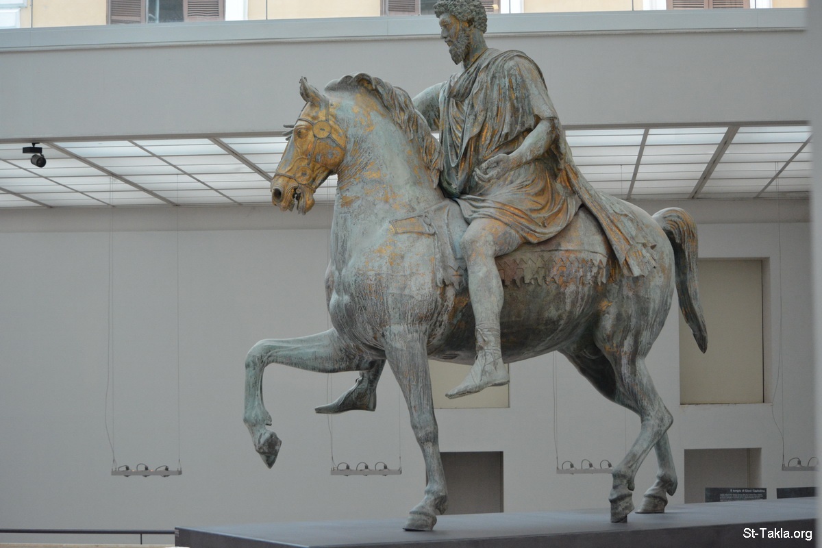 تمثال برونزي يصور ماركوس أوريليوس (مرقس أوريليوس أنطونينوس أوغسطس) وهو يخاطب جيشه من فوق حصانه، طول 4,24 م.، صنع سنة 175 م. (صورة 6) - صور متاحف كابيتوليني، روما، إيطاليا. وهو مجموعة متاحف في متحف واحد، موجود في أعلى تل كاپيتوليني، وأنشئ عام 1734 م. - تصوير مايكل غالي لموقع الأنبا تكلاهيمانوت، 21 سبتمبر 2014 م.