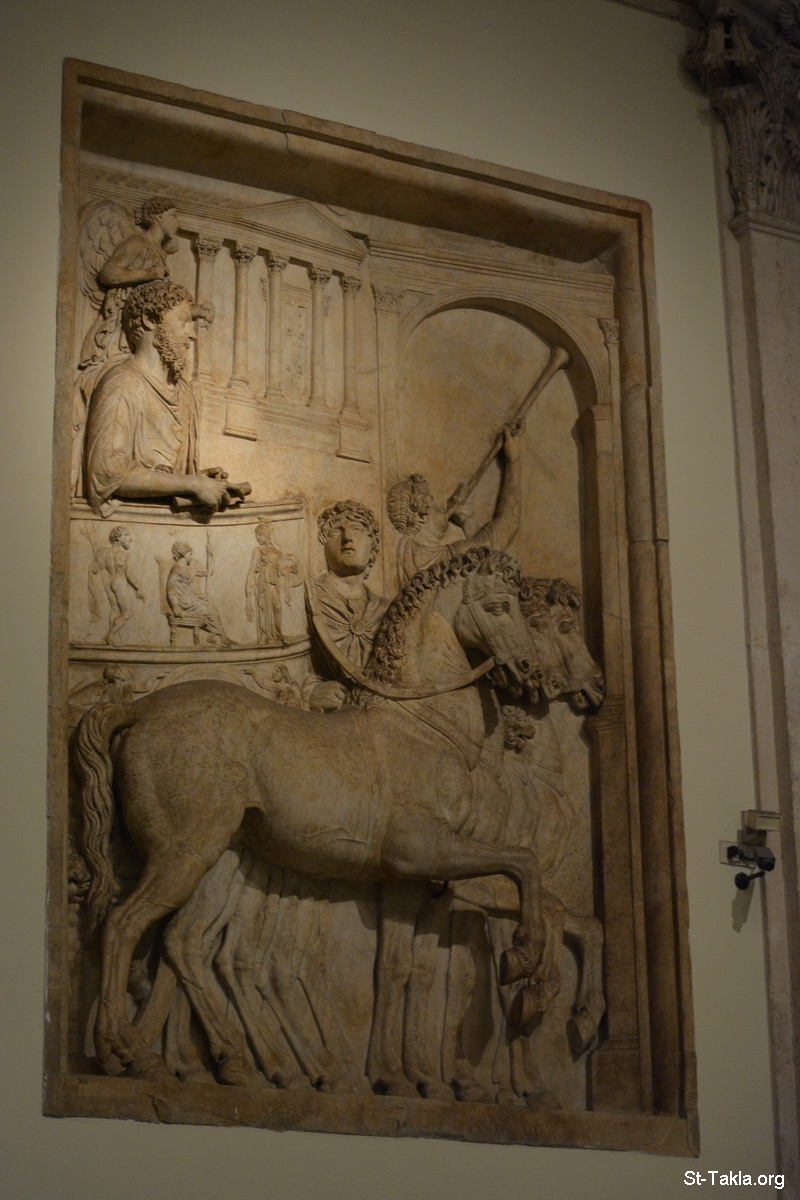 الإمبراطور ماركوس أوريليوس (161-180 م.) في انتصاره على القبائل الجرمانية. نقش بارز من قوس ماركوس أوريليوس بروما (يُزيّن رأسه جنيوس مجنح). - صور متاحف كابيتوليني، روما، إيطاليا. وهو مجموعة متاحف في متحف واحد، موجود في أعلى تل كاپيتوليني، وأنشئ عام 1734 م. - تصوير مايكل غالي لموقع الأنبا تكلاهيمانوت، 21 سبتمبر 2014 م.