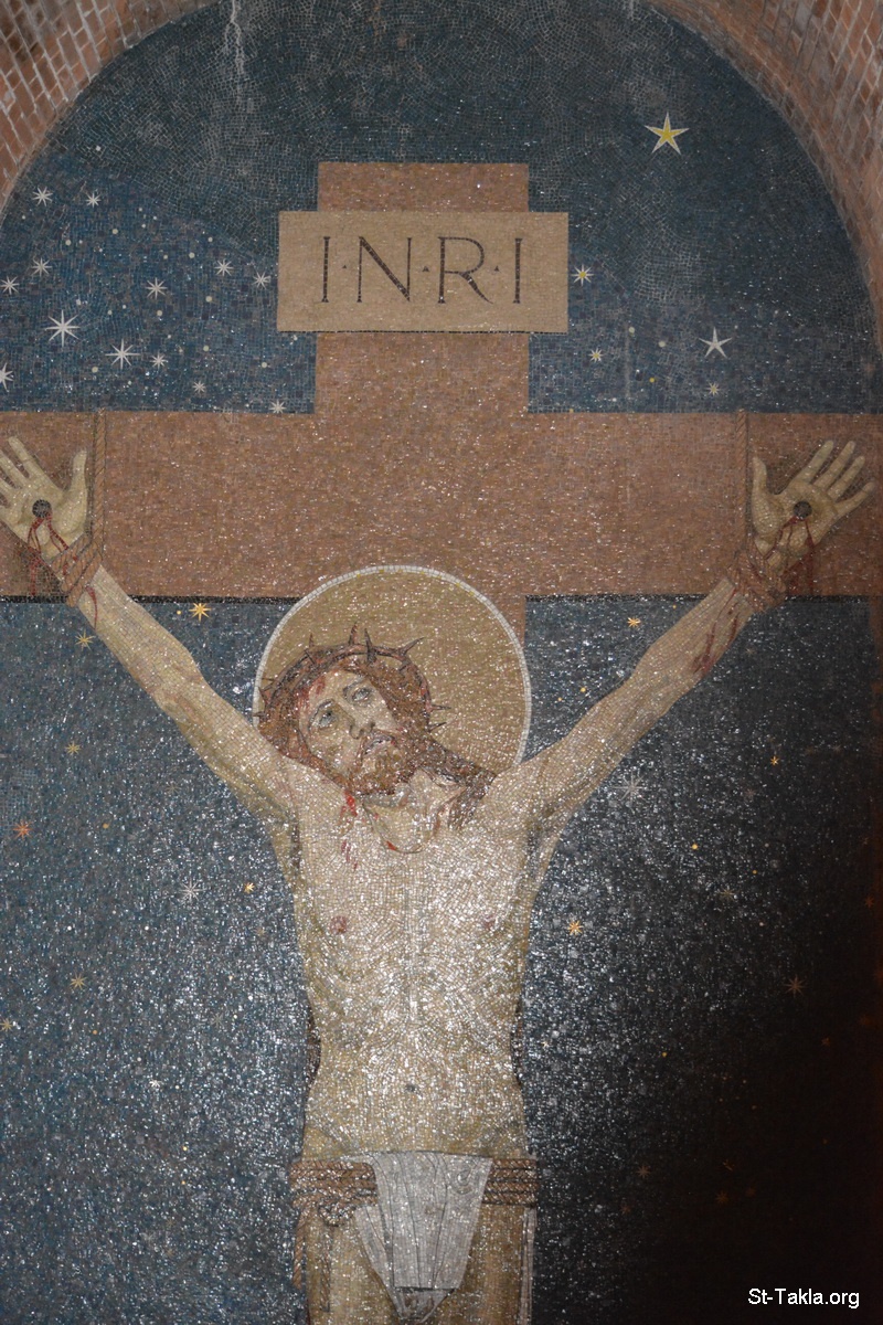 الصلب (صورة 2): فسيفساء السيد المسيح على الصليب. - صور متحف الريزورجيمينتو (الوحدة الإيطالية)، روما، إيطاليا. وهو موجود في النصب التذكاري مذبح الآباء (ألتاري ديلا باتريا) الذي تم انتهاء العمل به عام 1925. - تصوير مايكل غالي لموقع الأنبا تكلاهيمانوت، 21 سبتمبر 2014 م.