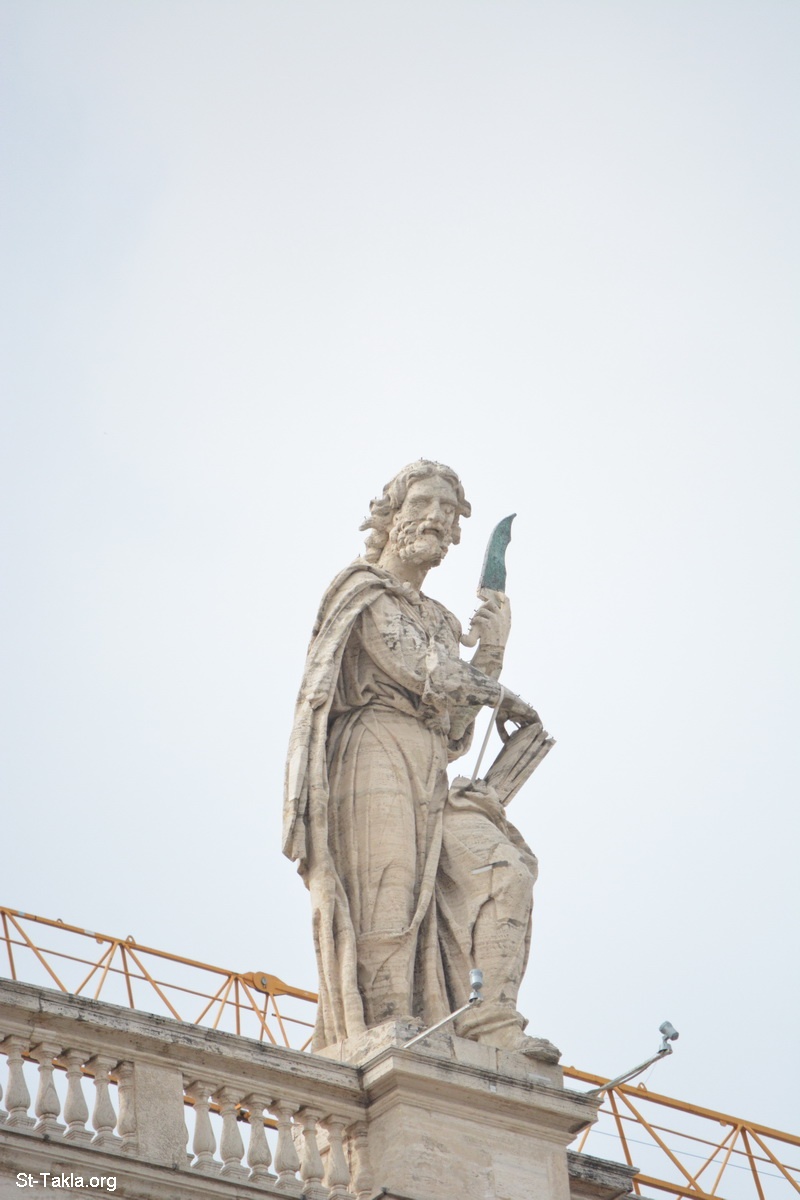Saint Bartholomew - From the statues of the facade of St. Peter's, designed by Carlo Maderno, 1608-1614, 116m wide, 53m high - St. Peter's Basilica: The Papal Basilica of St. Peter in the Vatican: Basilica Papale di San Pietro in Vaticano, Rome, Italy. Completed on 18 November 1626 - Photograph by Michael Ghaly for St-Takla.org, September 22, 2014.
