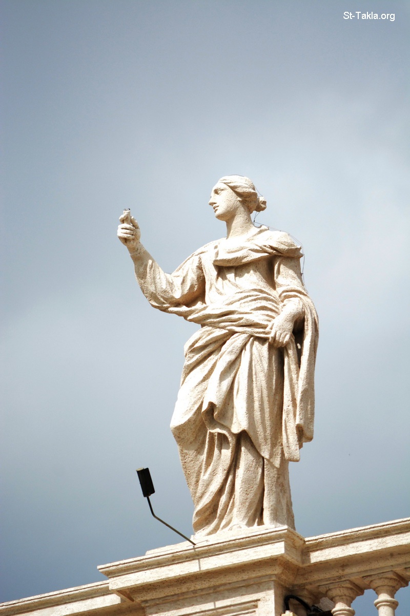 This is a part of a group erected between July and December 1668. Part of the head is missing, and her right hand originally held pliers, the instrument of her torture and martyrdom.