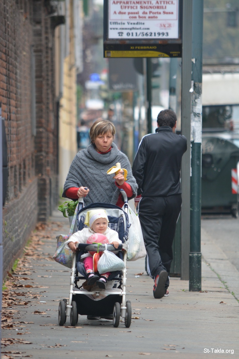 A mother walking her baby in a stroller, while eating a banana. - Various photos from Turin, Italy - Photograph by Michael Ghaly for St-Takla.org, October 9, 2014.