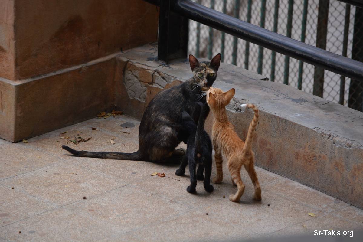 Mother cat with two kittens, one black and the other orange - Cat (photo 53), Alexandria Zoo, Egypt - Photograph by Michael Ghaly for St-Takla.org, 29 June 2014, 20 Sep. 2015.