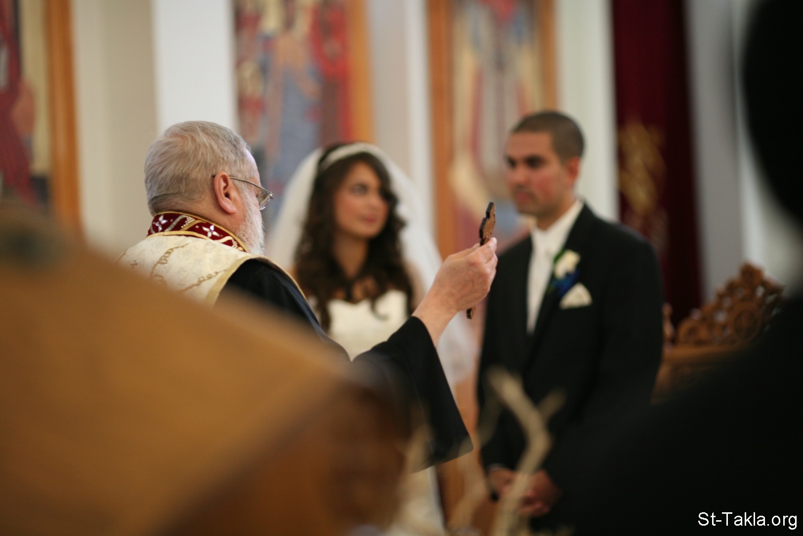 زوجان جديدان (زوج وزوجة) أمام المذبح والأب الكاهن يصلي - سر الزيجة (الزواج) في الكنيسة القبطية الأرثوذكسية