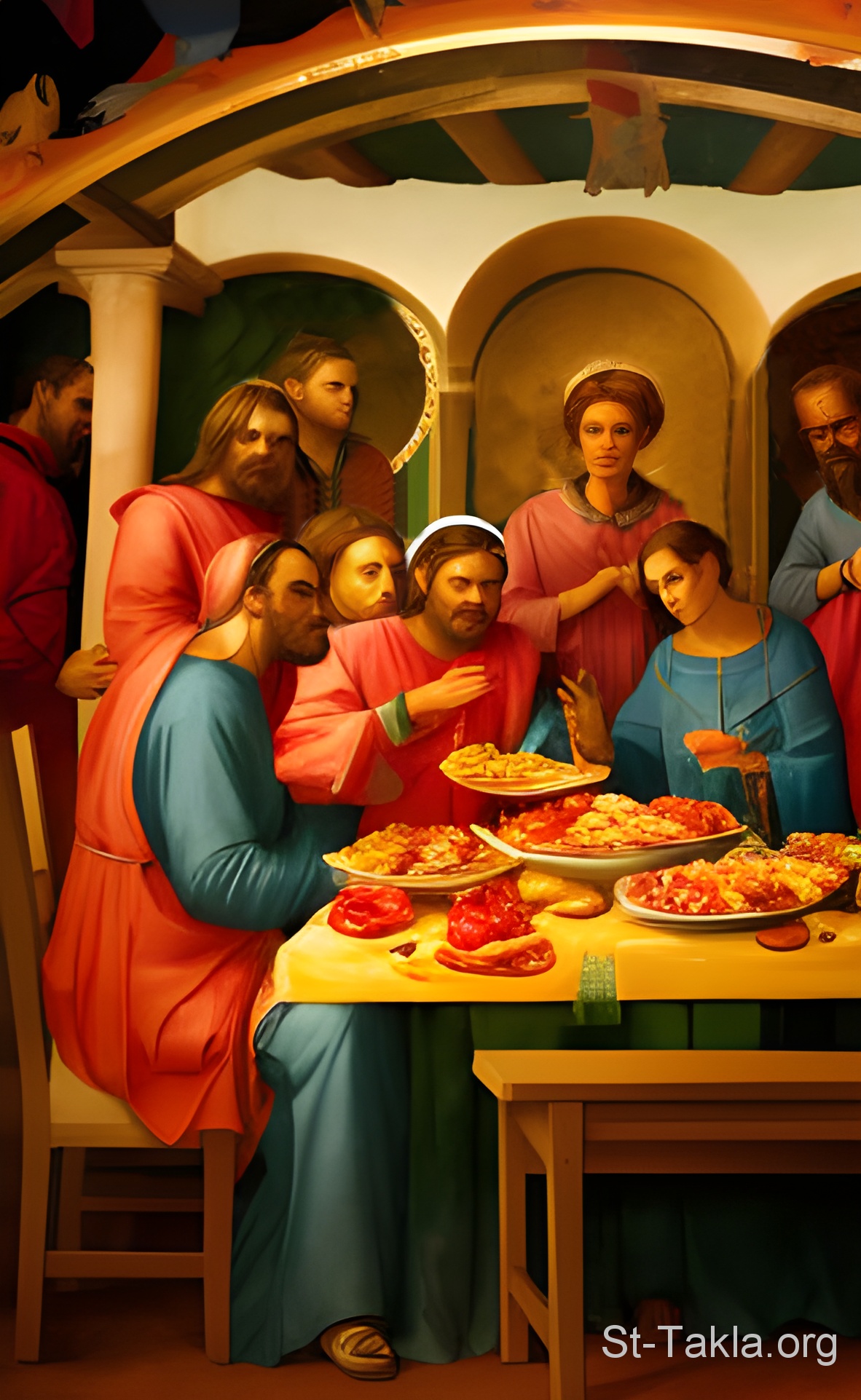 وليمة الأغابي (تناول غذاء المحبة، الأكل، الطعام) في الكنيسة الأولى - فن بالذكاء الاصطناعي، فكرة مايكل غالي لموقع الأنبا تكلاهيمانوت، 27 أبريل 2023 م.
