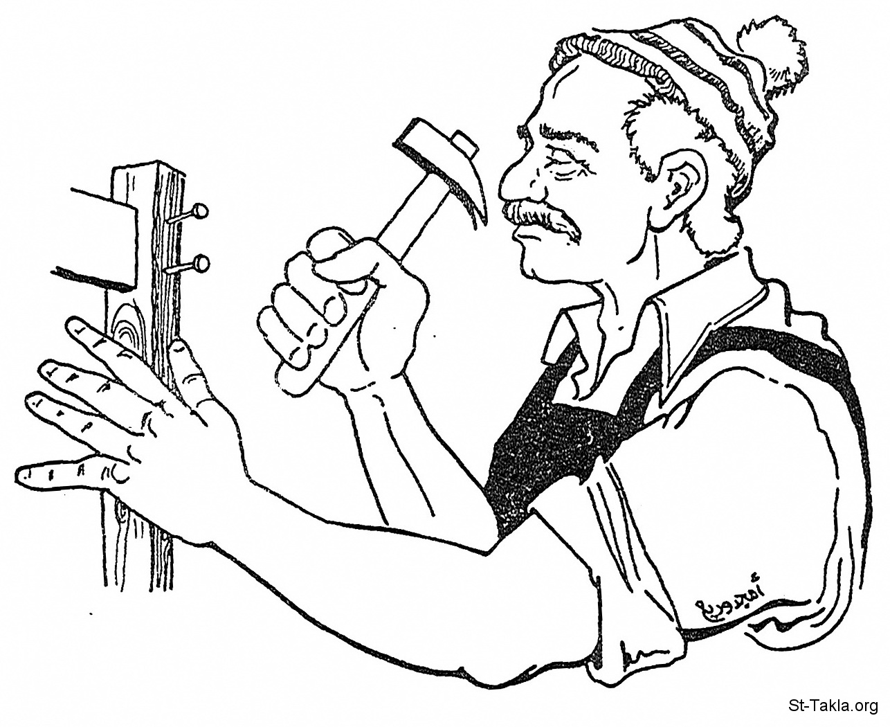 رجل نجار يدق مسامير بالمطرقة (الشاكوش) - رسم أمجد وديع.