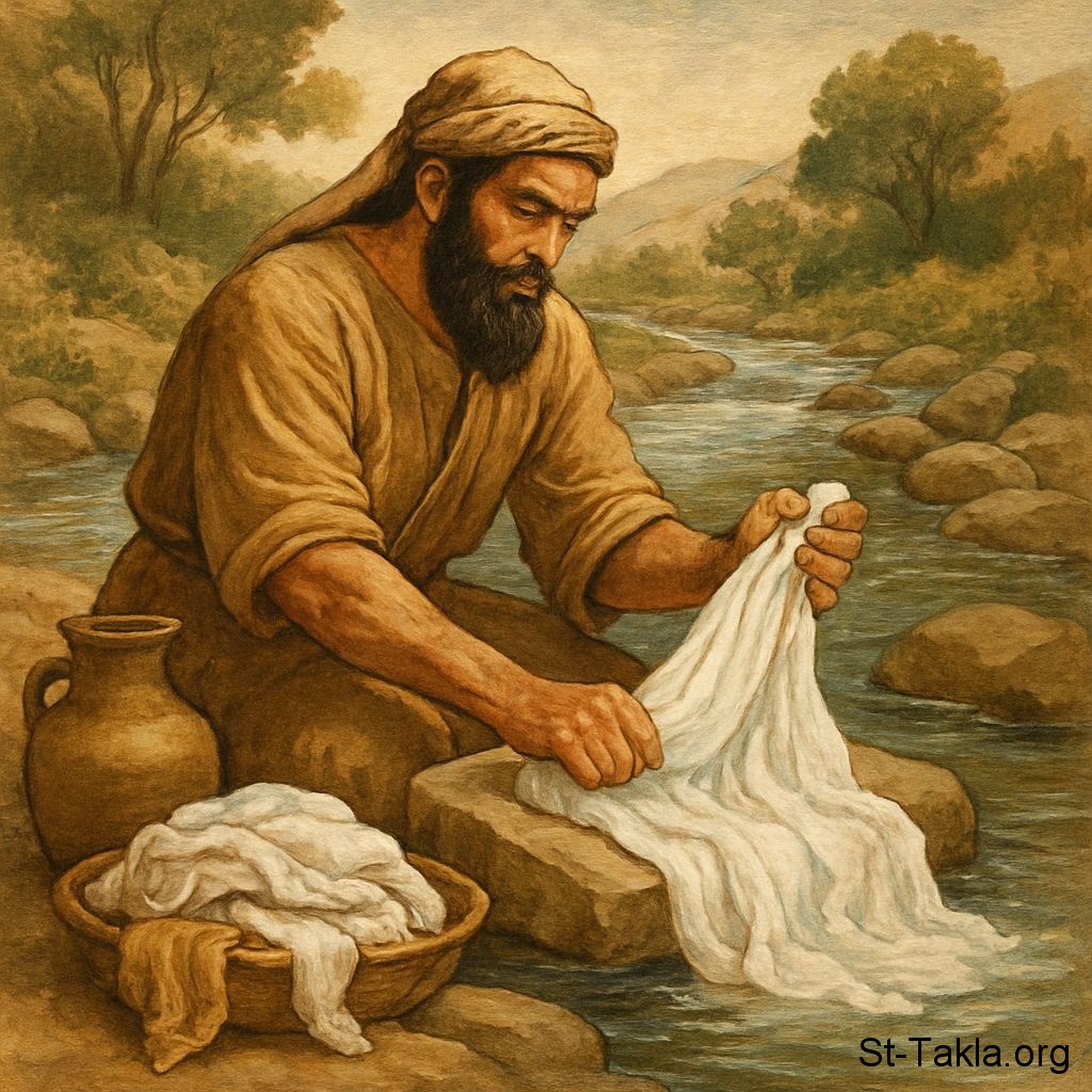 رجل عبراني يبيض الملابس: القصار (غاسل الملابس). - فن بالذكاء الاصطناعي، فكرة مايكل غالي لموقع الأنبا تكلاهيمانوت، 25 يوليو 2025 م.
