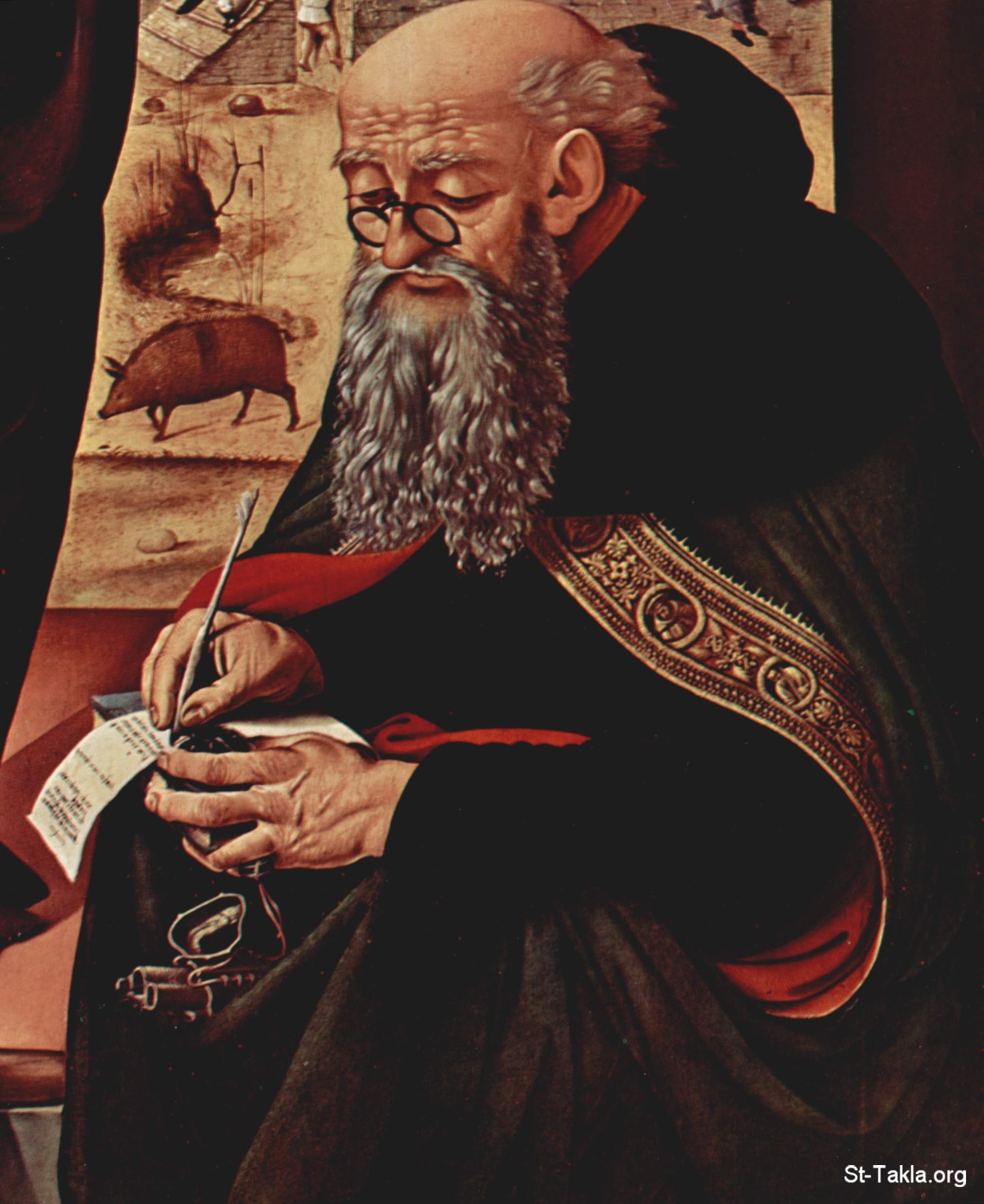 لوحة القديس أنطونيوس أب الرهبان، بها جانب من زيارة القديس نيقولاوس، رسم الصورة الفنان بيرو دي كوسيمو، ما بين 1470-1480. محفوظة في ناشونال جاليري أوف آرت (متحف الفنون القومي)، واشنطن العاصمة.