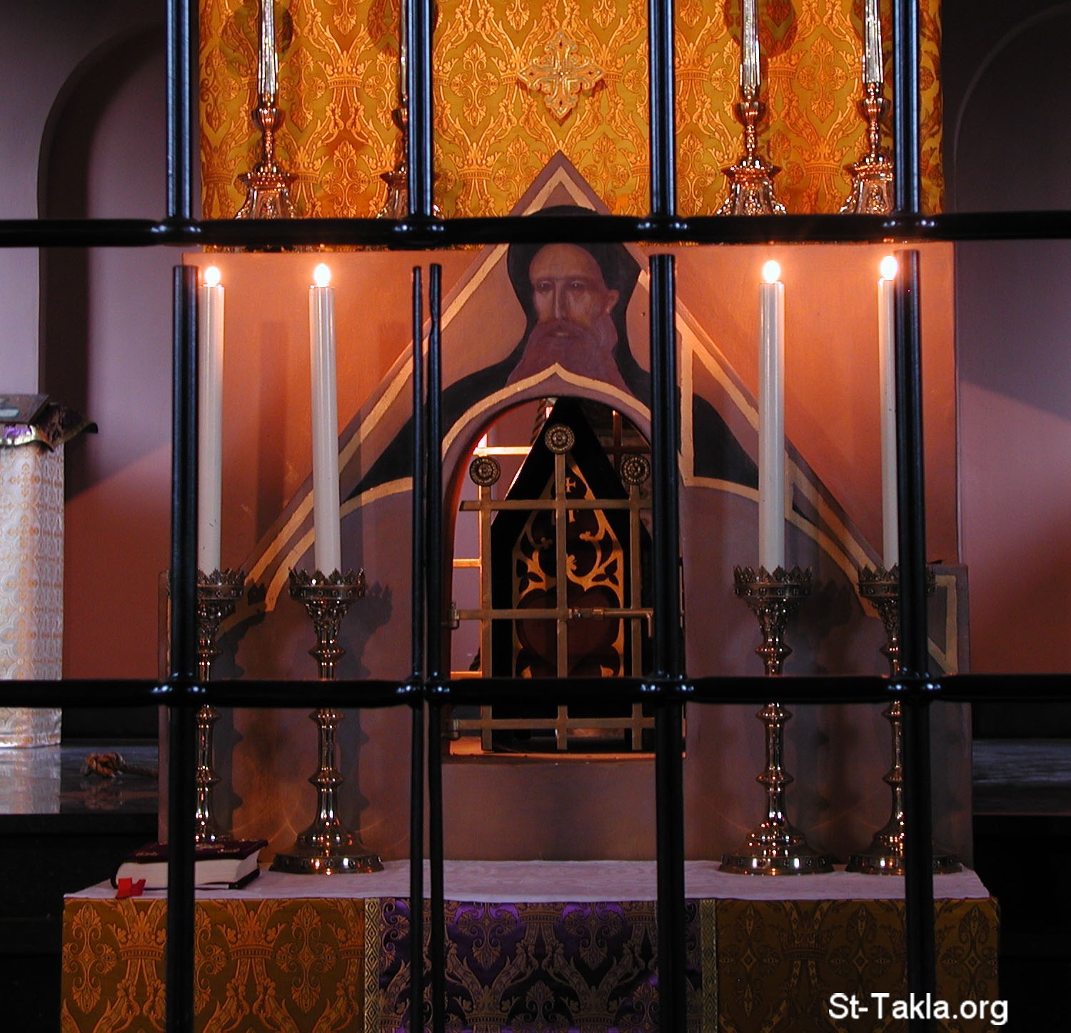 The former main altar of the hermitage church in Warfhuizen in the Netherlands with a mural of Anthony Abbot and a reliquary with some of his relics. Since then they have been moved to a new golden shrine on a side-altar especially made for them.