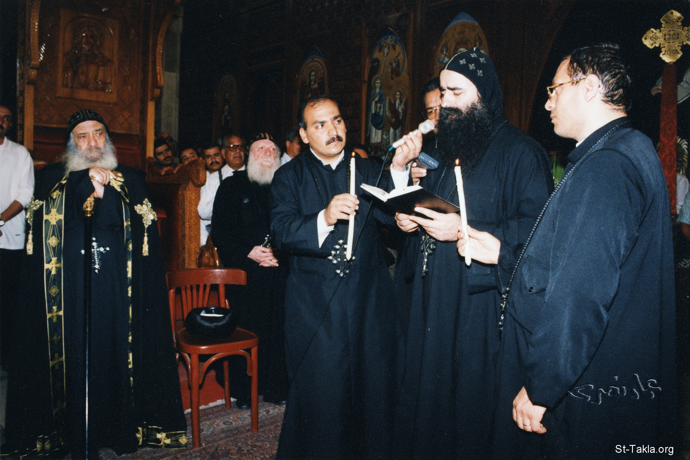 [His Grace Bishop Youannes reading Gospel and His Holiness Pope Shenouda III listening in background at Ragheb Moftah's funeral], June 18, 2001 / Emad Nassry [photograph]