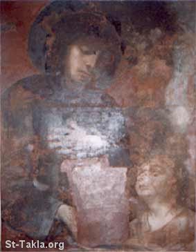 القديسة مارين التي تنكرت في زي الرهبان وقامت بتربية طفل. وهي لوحة تم ترميمها حديثًا في كهف القديسة مارينا في لبنان. الصورة لماري، 1999 م.