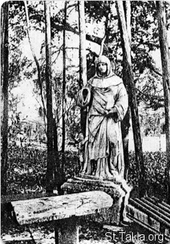 تمثال القديسة مارينا الناسكة (الأب مارين) في حديقة معهد التعليم اللاهوتي البطريركي في فينيسيا، مع ابنها المزعوم على يمينها - الصورة من كتاب حياة وأعمال القديسة مارينا، لـ ليون إليوجي، باريس، 1905.