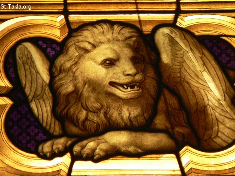 رمز القديس مرقس الإنجيلي، الأسد، رسم زجاج معشق في جنوب ممشى جناح صحن كاتدراية كولون، ألمانيا.