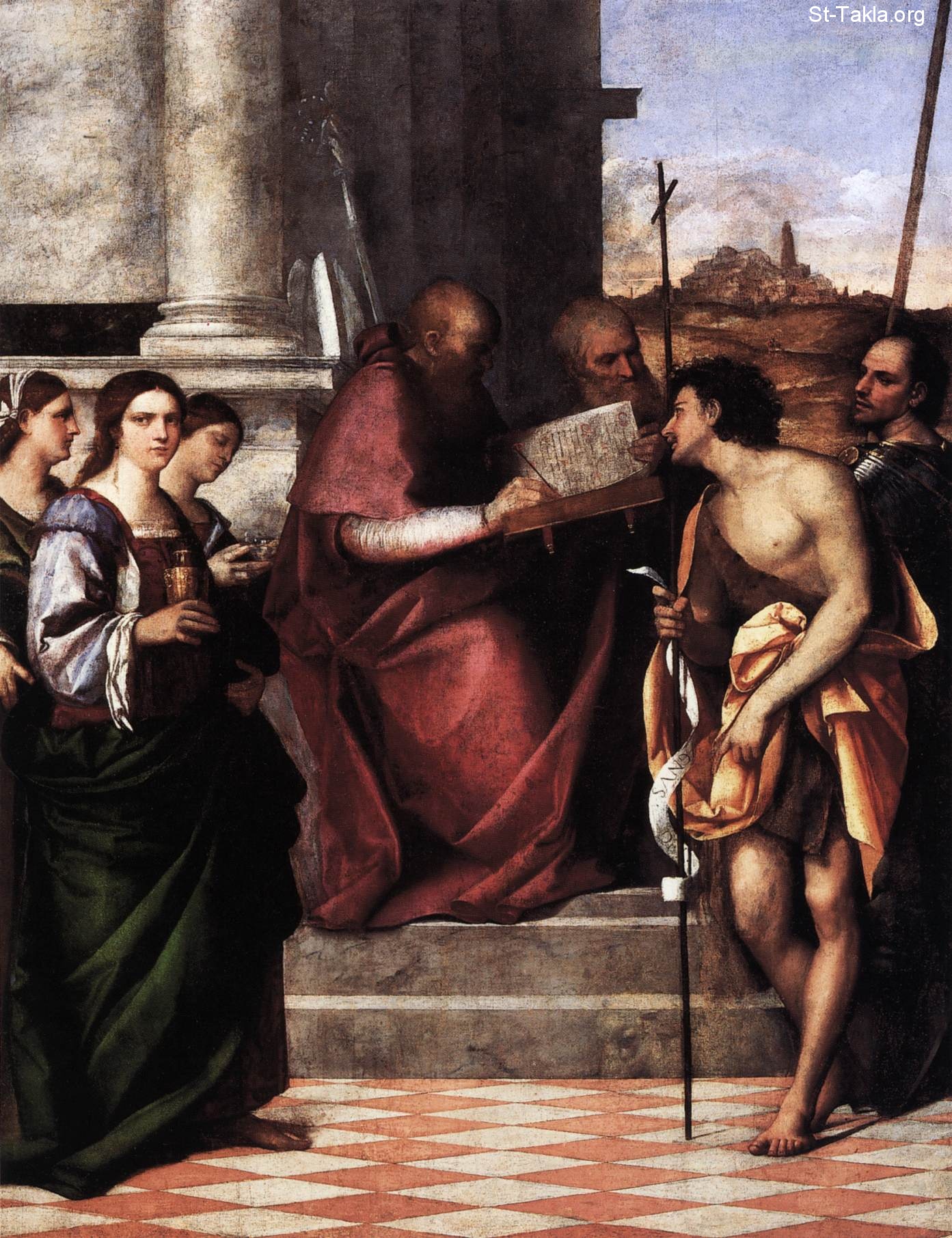 This is an altarpiece depicts St John Chrysostom with Sts Catherine, Magdalen, Lucy, John the Evangelist, John the Baptist and Theodore. It is a painting with an official, doctrinal message, based on the association of the three Johns. Chrysostom is sitting side on, not in compliance with any mannerist idiosyncrasy but simply to enable us to see and read the book of his golden Word.