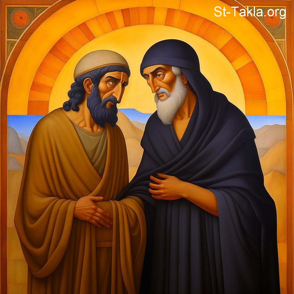 اثنان من الآباء يتحدثان (صورة 17)، محادثة، مناقشة، قديسان، رهبان - فن بالذكاء الاصطناعي، فكرة مايكل غالي لموقع الأنبا تكلاهيمانوت، 30 يناير 2024 م.