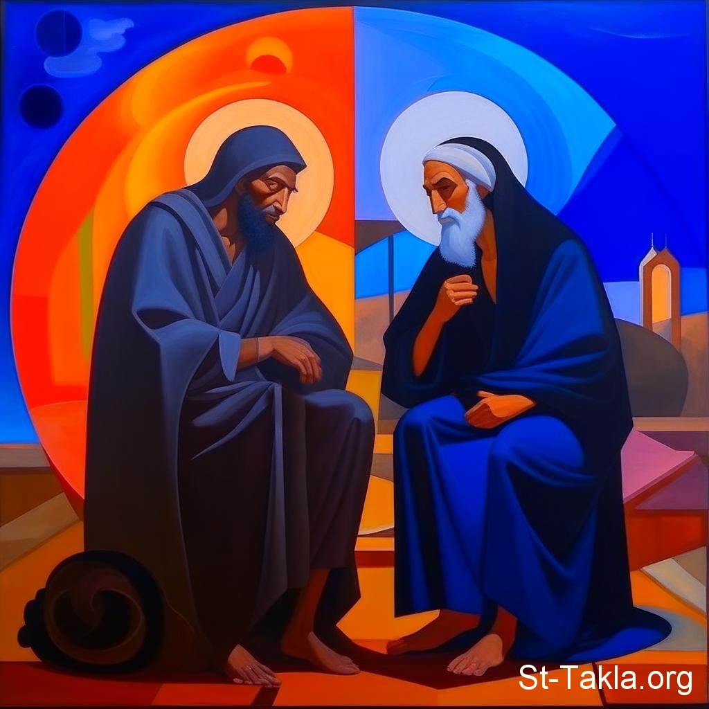 اثنان من الآباء يتحدثان (صورة 30)، محادثة، مناقشة، قديسان، رهبان - فن بالذكاء الاصطناعي، فكرة مايكل غالي لموقع الأنبا تكلاهيمانوت، 30 يناير 2024 م.